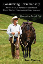 In Considering Horsemanship one of America's most prolific and devoted equestrian writers, Tom Moates, returns taking an all new approach to thinking about horsemanship.  The subtitle sums it up: A Book of Ideas Inspired By Two Decades of Harry Whitney Horsemanship Clinic Journals.  Moates revisits the tattered pages of a pile of clinic notebooks filled with observations and insights scribbled down at round pens, arenas, bunkhouses, and barns across America and over the years—then each chapter kicks off with a thought provoking quote from his mentor plucked from those pages.  These sage remarks become launching points for in depth discussions on aspects of horsemanship with unique insights, inspirations, and often comical queries in Moates's celebrated style.